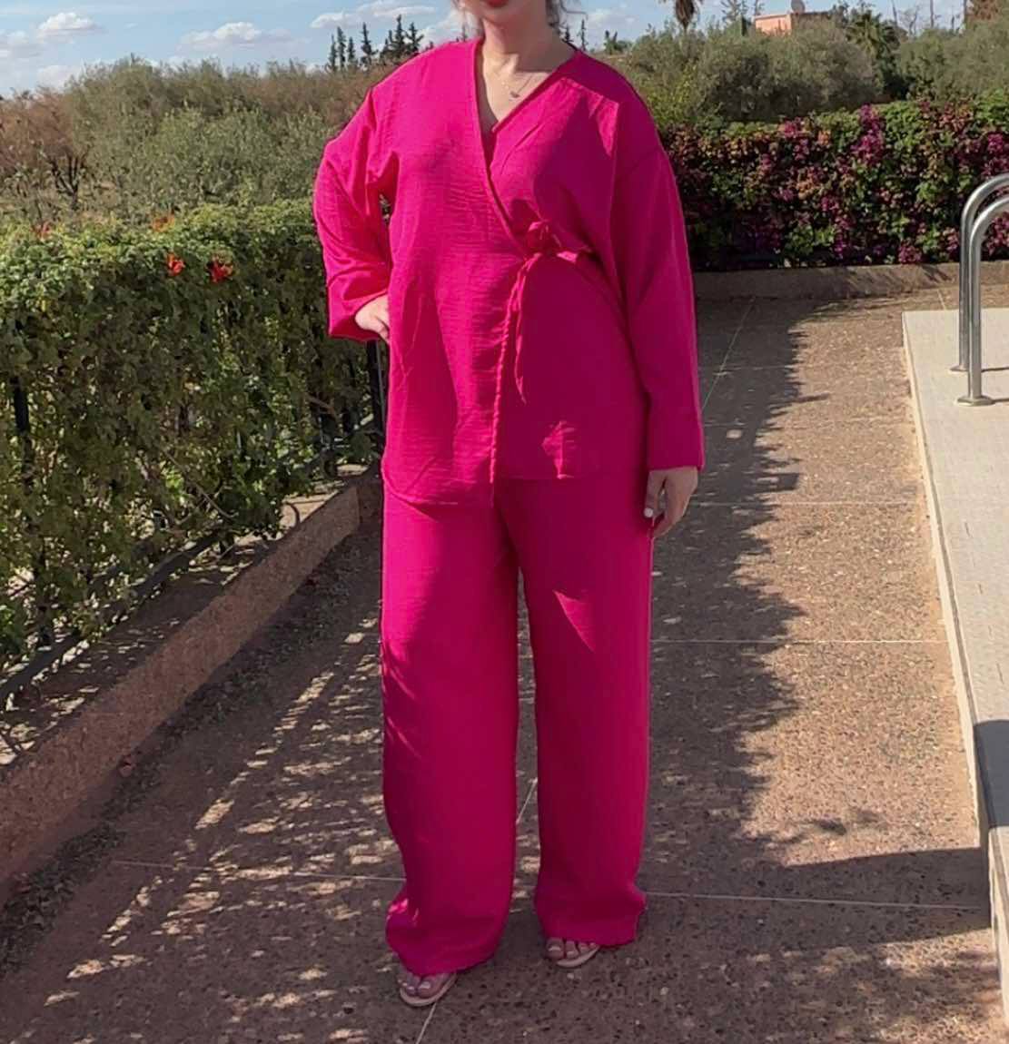 Cet ensemble deux pièces en lin allie élégance et confort. Fabriqué à partir de tissu léger et respirant, il est parfait pour les journées chaudes. Le haut à manches courtes et le pantalon évasé offrent une silhouette flatteuse et polyvalente pour toutes occasions. Les deux pièces peuvent être portées ensemble ou séparément pour créer différents looks tendance. Profitez de l'élégance sans compromis sur le confort avec cet ensemble en lin.